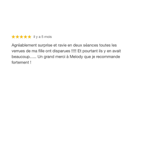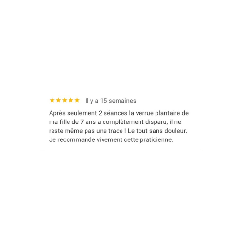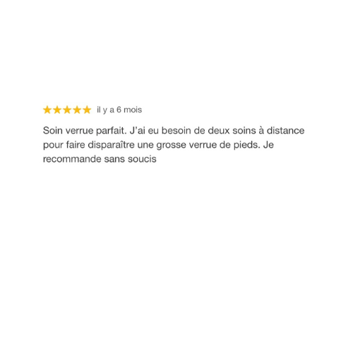 En bonus exclusif jusqu'au 05/08/2025 : Si les verrues sont encore présentes après deux suivis, tous les suivis suivants seront gratuits jusqu’à leur disparition !