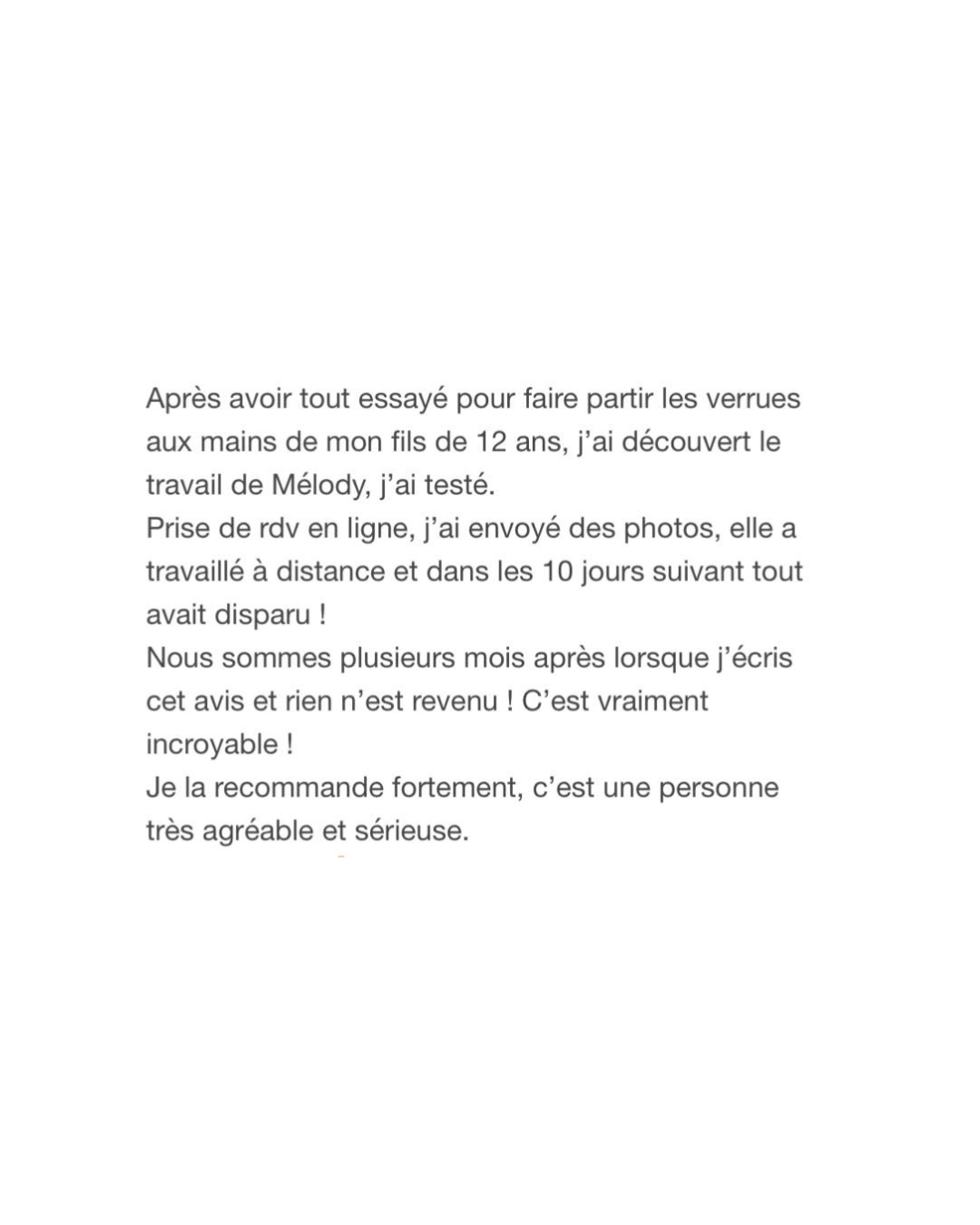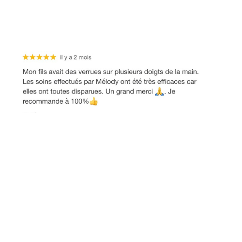 Lorsque je me suis formée, j'ai essayée ma méthode sur lui. À ma grande surprise, après seulement quelques séances, sa verrue a disparu ! J'ai découvert la puissance du magnétisme et c'est là que j'ai choisi de me spécialiser dans le traitement des verrues.